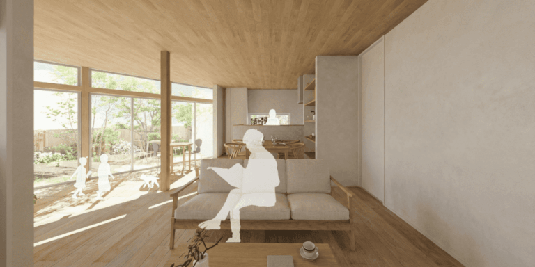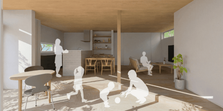 土間で過ごす家族の様子を、やわらかく見守れる距離感の心地よさを感じられます。