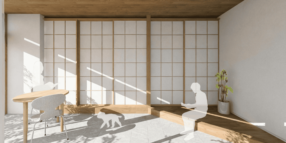 土間とLDKの間に断熱障子を設け、安定した温熱環境と、ゆらぎのある温熱空間を両立。さらに、夏の強い日射を抑えるため、南面には外部シェードを計画しています。