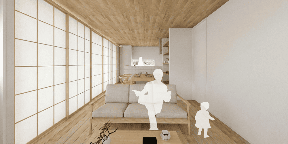 夜間などに断熱障子を閉めることで、LDKは一転して、包み込まれるような落ち着いた空間へと様変わりします。光や視線をやわらかく整えながら、家族の気配は感じつつも、ほどよい距離感を保てる暮らし設計です。