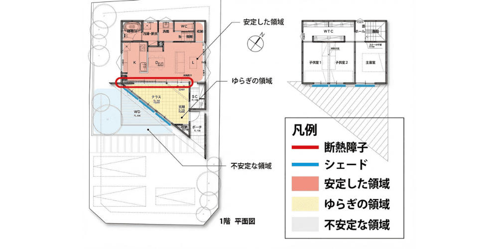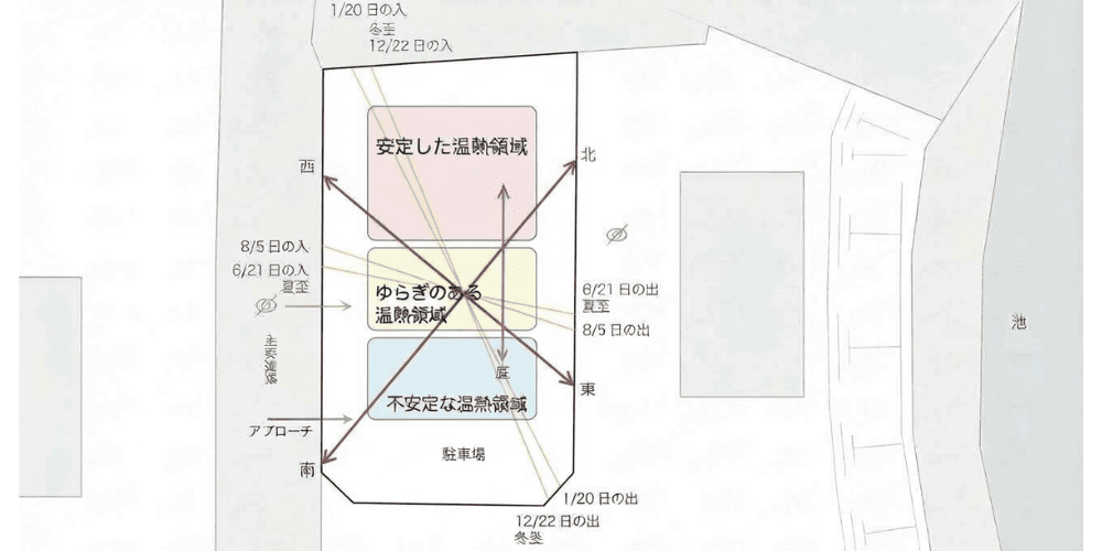 年間の太陽の動きや土地の特性を丁寧に読み解き、「安定した温熱領域」「ゆらぎのある温熱領域」「不安定な温熱領域」という3つの温熱バランスを計画しました。