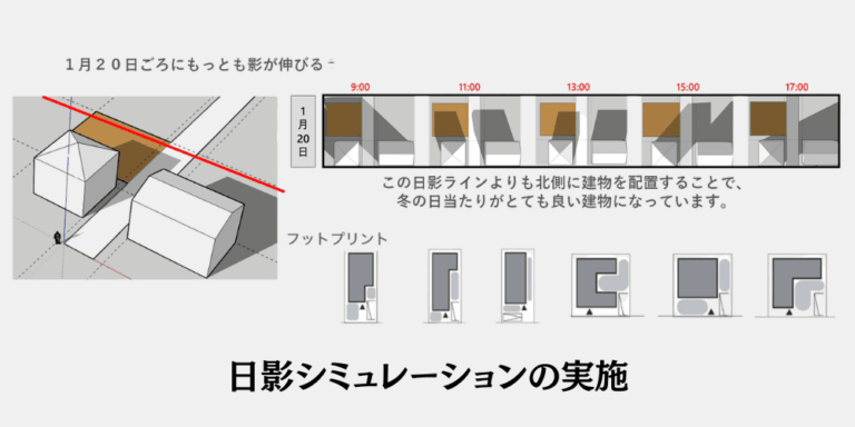 太陽の動きと周囲の建物の影をもとに、