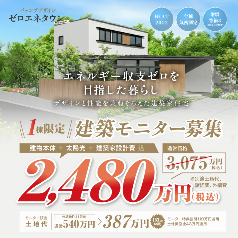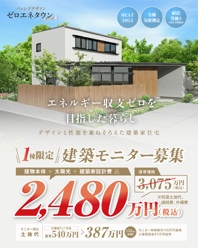 ※付帯工事、諸経費、外構費は別途 ※適用建物補助金(みらいエコ住宅2026事業GX志向型住宅:110万円、田川市内業者利用奨励金:50万円、浄化槽設置補助金32.2万円) ※適用土地補助金(市有地等購入奨励金43万円) ※モニター適用諸条件あり ※プラン変更や仕様変更となった場合は価格や特典価格に増減発生する場合がございます